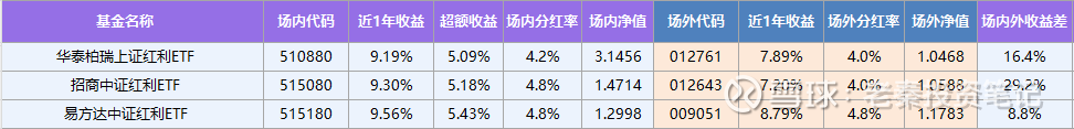 易方达中证红利ETF近一年收益率9.56%,场外辘集基金收益率8.79%,收益差比例达到8.8%;