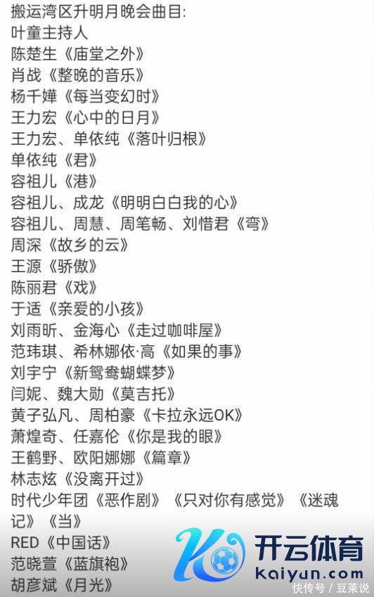 容祖儿连唱三首 容祖儿有新一代港乐天后之称,其唱功惊东谈主。凭证网上爆出的一份名单。此次歌手容祖儿将饰演三个节目,率先是个东谈主独唱《港》,然后是和成龙年老齐唱《辉煌晰楚我的心》,临了则是和周笔畅、刘惜君、周慧齐唱《弯》。期待容祖儿阐扬。