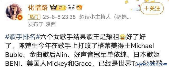 #夏令图文激励缱绻# 【《歌手2025》歌王之战竞演战绩揭晓/陈楚生获歌王惹群嘲】 8日晚间,歌手总决赛歌王之战战绩揭晓,最终排行如下: 歌王/陈楚生(第又名)。 第一轮帮唱,与郑钧配合《赤裸裸》,排行第三;第二轮独唱,原创曲《获奖之作》,以平凡东说念主生主题激发共识,空洞收货断层第一。