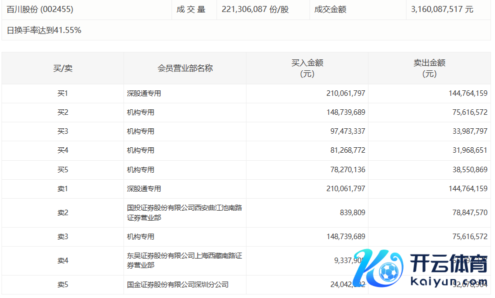 百川股份当天跌1.77%,成交额21.65亿元,换手率30.19%,盘后龙虎榜数据披露,深股通专用席位买入1.89亿元并卖出1.65亿元,有4家机构专用席位净卖出1.40亿元。