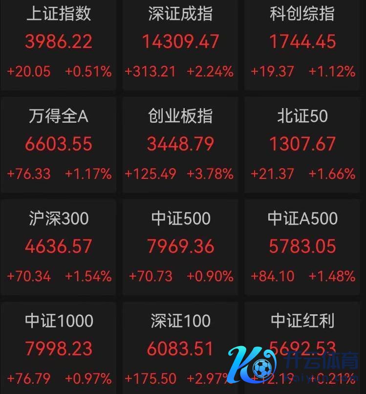 截止收盘,上证指数涨0.51%,报3986.22点;深证成指涨2.24%,报14309.47点;创业板指涨3.78%,报3448.79点;科创综指涨1.12%,报1744.45点。沪深两市成交额约23228.69亿元,较前一个来去日放量约1887.93亿元。